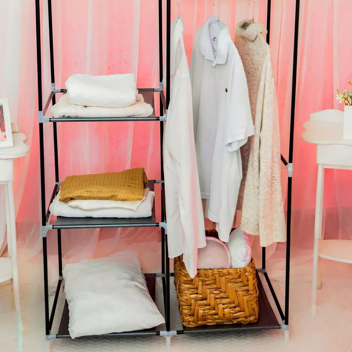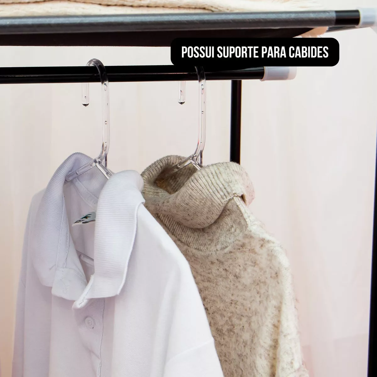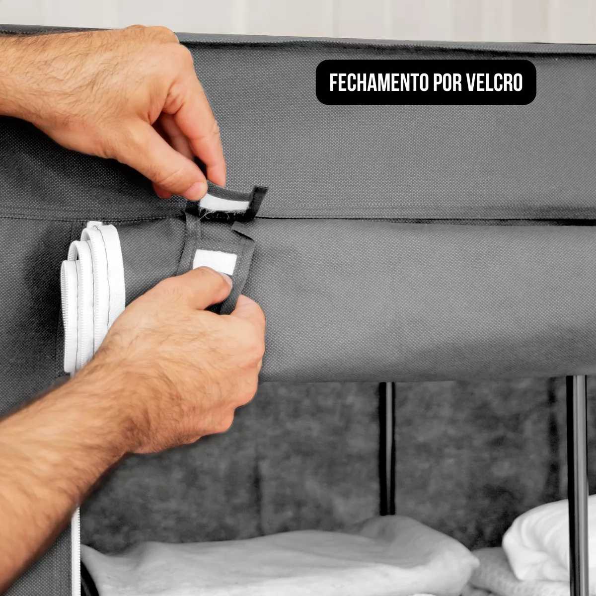 possui dois grandes espaos com cabideiro e 4 prateleiras. Possui cortina de rolo e abre e fecha com fechamento. Ele projetado em tecido respirvel de excelente qualidade e muito fcil de limpar. Tambm fcil de montar.