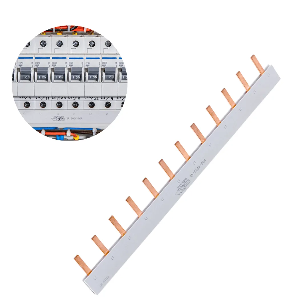 * **Barramento Pente (ou Pente de Conexão):** É uma barra condutora de eletricidade, geralmente feita de **cobre** isolado, que tem a forma de um pente. Ele serve para **conectar vários dispositivos elétricos (como disjuntores) de forma rápida e segura** a uma mesma fase elétrica, substituindo o uso de vários cabos individuais para essa conexão.