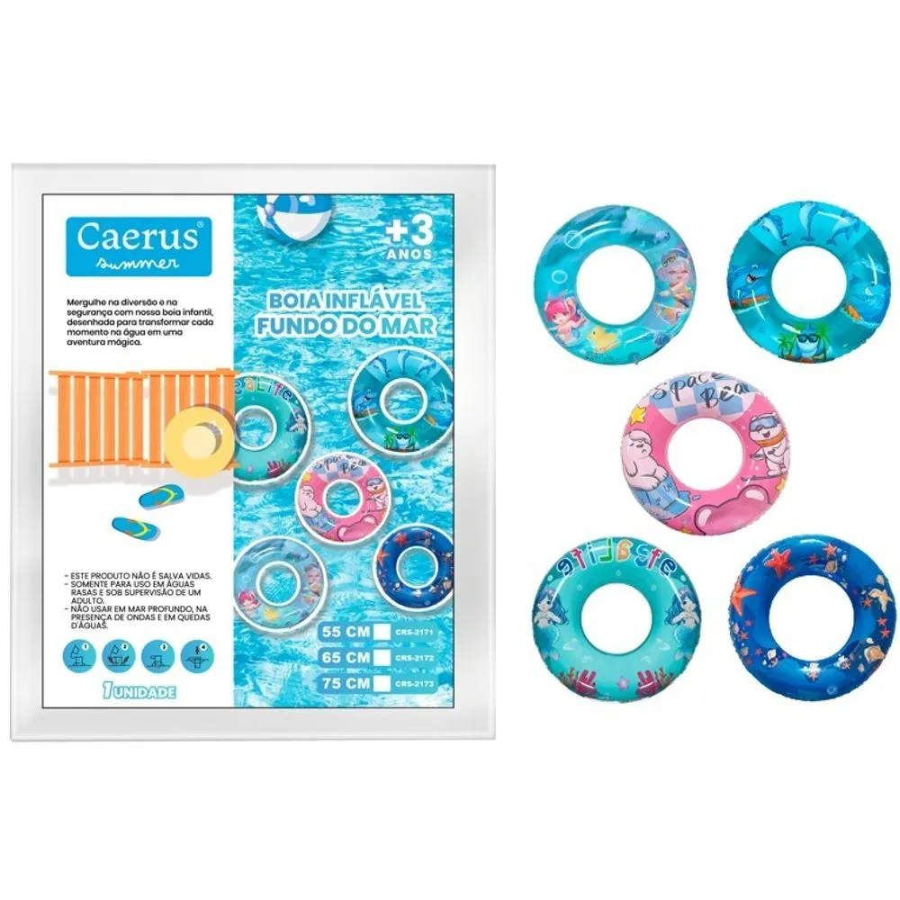 Transforme o dia de sol em uma aventura subaquática! A boia circular **Cearus CRS-2166** apresenta uma estampa colorida e divertida de animais marinhos, ideal para estimular a imaginação dos pequenos enquanto eles se refrescam na piscina ou no mar.