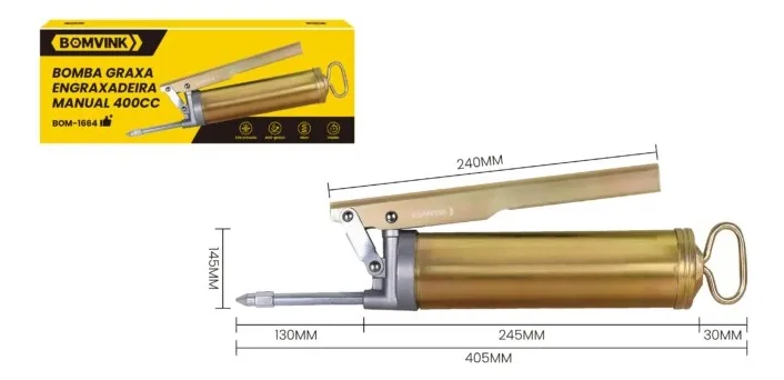 Produzida em metal resistente, comporta até 400 gramas de graxa, garantindo durabilidade e desempenho. Ideal para quem busca eficiência e praticidade na manutenção de equipamentos.