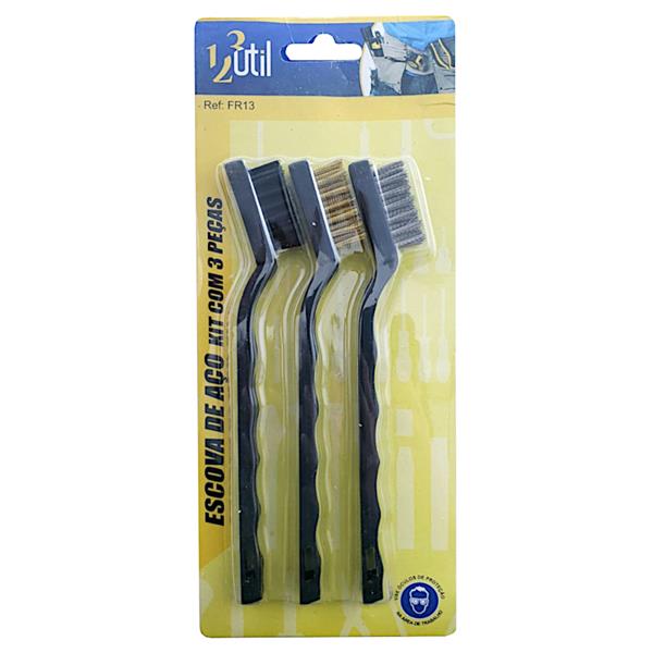 Escova de Aço C/ Cabo 3 Peças Multiuso Limpeza