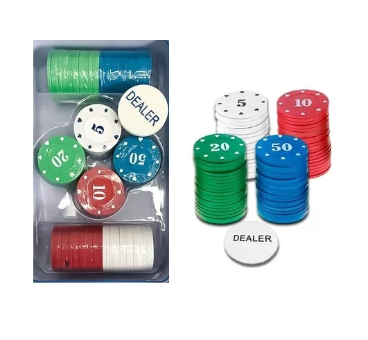Estojo com Fichas de Poker contendo 100 unidades de fichas enumeradas, nos valores de 5, 10, 20 e 50.