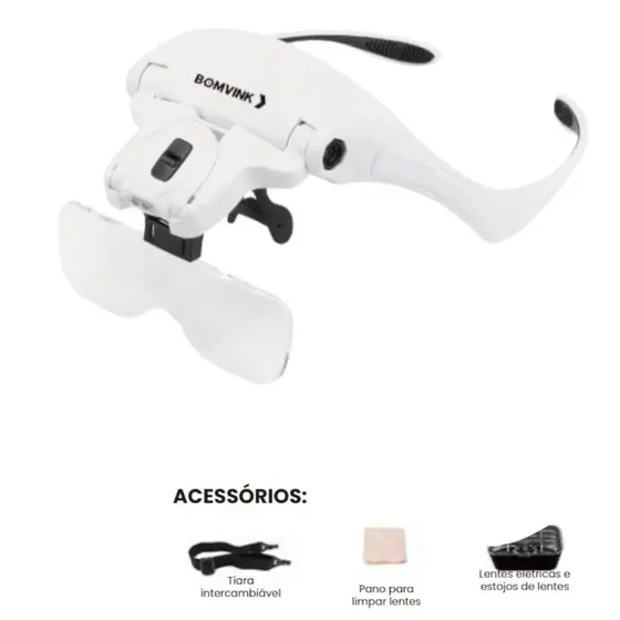 O BOM-7461 da Bomvink é um óculos com lupa de cabeça ideal para trabalhos que exigem máxima atenção aos detalhes. Com estrutura leve e ergonômica, oferece diferentes ampliações e iluminação LED embutida, permitindo trabalhar com as mãos livres e visão ampliada mesmo em ambientes com pouca luz.