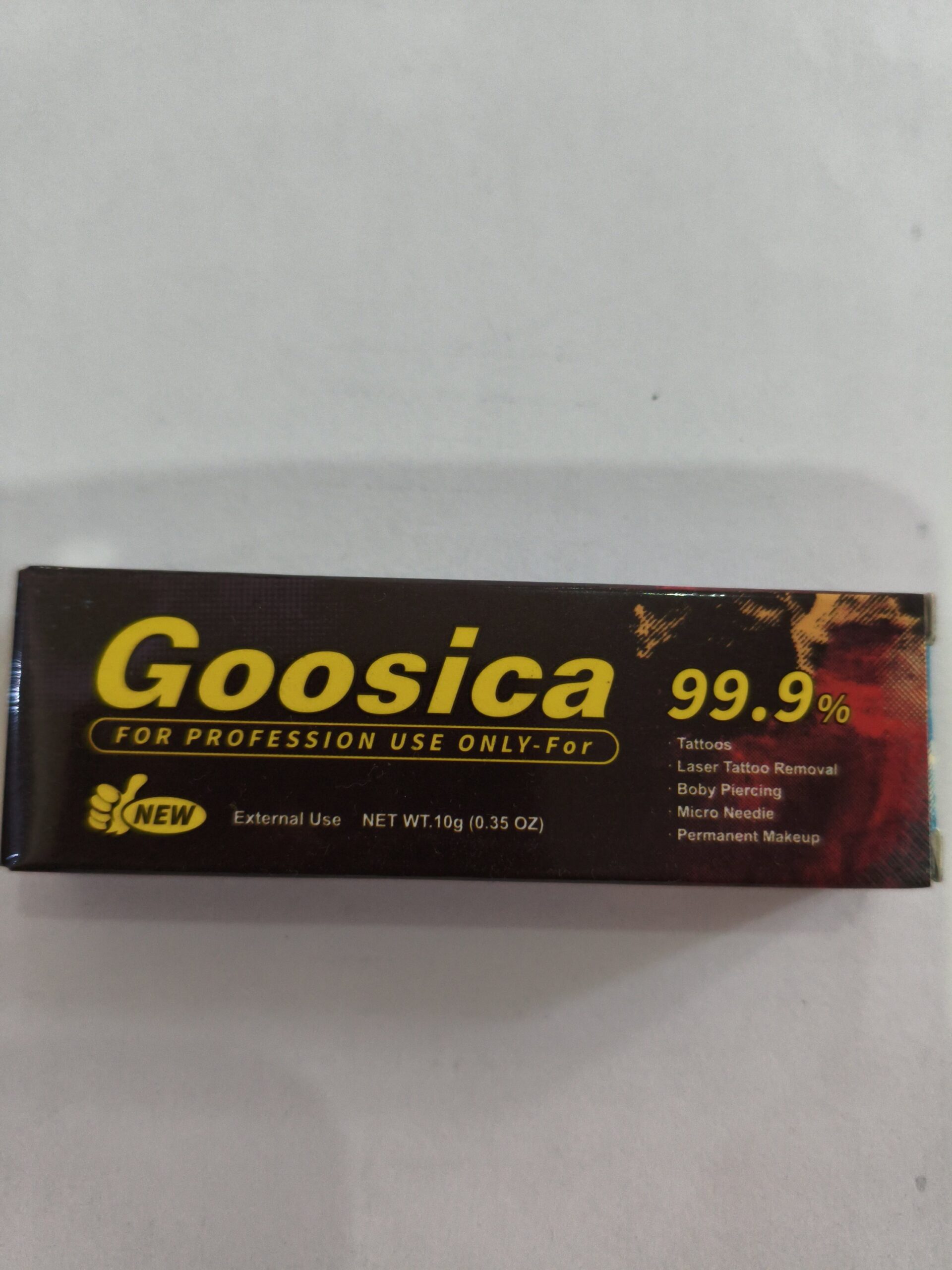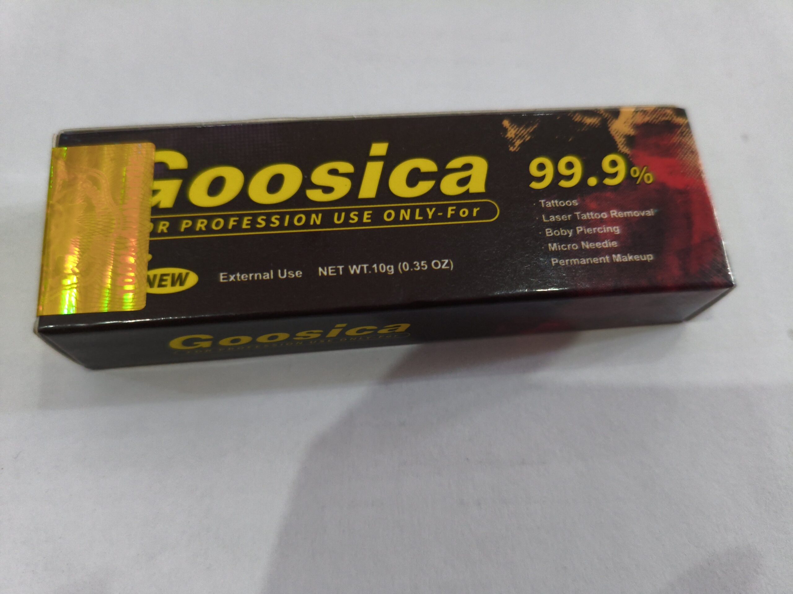 Anestésico goosica 99.9%, é um anestésico de alta intensidade e rápida ação, sendo um eficiente método para alívio da dor em procedimentos estéticos, como tatuagens, micropigmentação, microblading, piercing, depilação a laser ou cera e muitos outros.